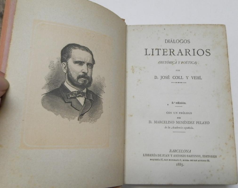 Coll y Vehí, José Diálogos literarios (retórica y poética). Enciclopedia para la juventud Barcelona, Librería de Juan y Antonio Bastinos, 1885. Tapa dura. 13x19 cm. 598pp. Deslucido. Encudernación algo endeble. Motitas de óxido.