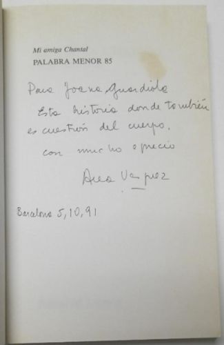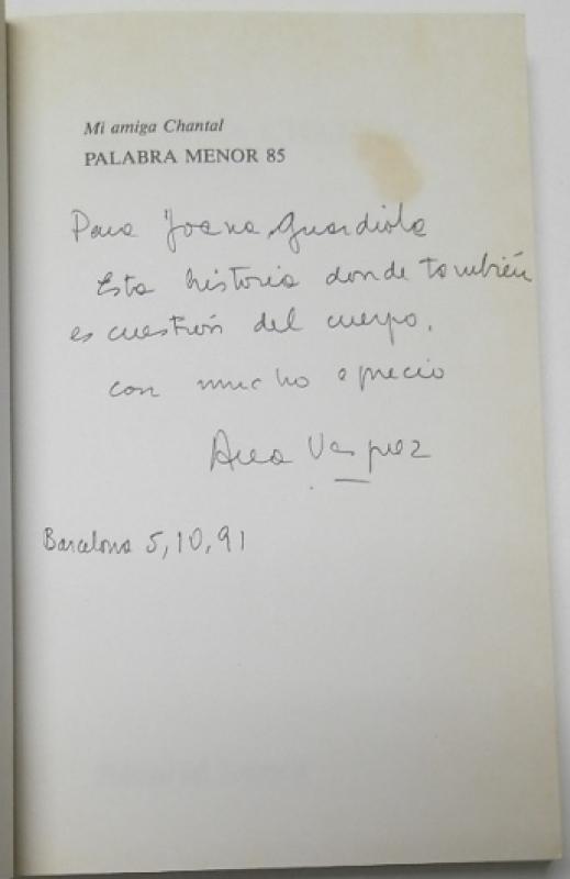 Vásquez, Ana Mi amiga Chantal Barcelona, Lumen, 1991. Rústica con solapas. 12x19 cm, 271pp. Buen estado. Dedicado y firmado por la autora.