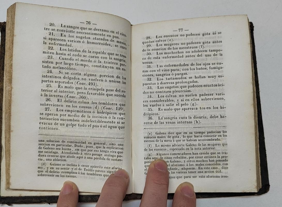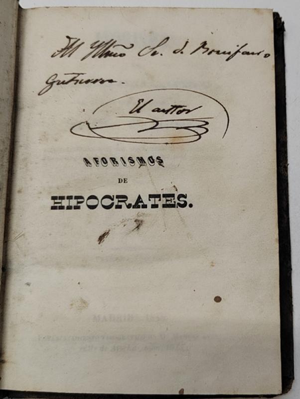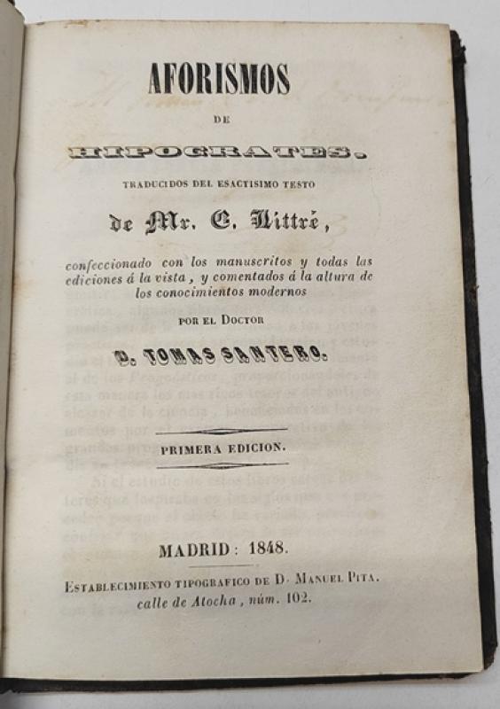 E. Littré, Tomás Santero Aforismos de Hipócrates Madrid, Establecimiento Tipográfico de D. Manuel Pita, 1848. Tapa dura. 11x16 cm, 311pp. Dedicatoria del autor. Tapas deslucidas, interior bien.