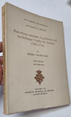 Pedro Voltes Bou Barcelona durante el gobierno del Archiduque Carlos de Austria (1705-1714). Tomo tercero. Documentos Instituto Municipal de Historia, 1970. Rústica con solapas. 17x24,5 cm. 211pp. Buen estado.
