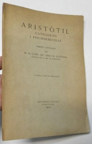 Aristòtil Categories i perihermeneies Versió catalana de Josep M. Llovera. Barcelona, Impremta Altés, 1929. Rústica. 16,5x24,5 cm. Firma de antiguo propietario. Dedicado por el autor de la versión. Buen estado, algo deslucido.