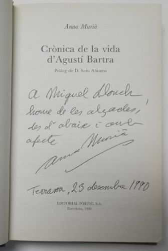 Murià, Anna Crònica de la vida d'Agustí Bartra Editorial Pòrtic, 1990. Tapa dura con sobrecubierta. 14,5x23 cm. 347pp. Libro en catalán. Buen estado. Dedicado y firmado por la autora.