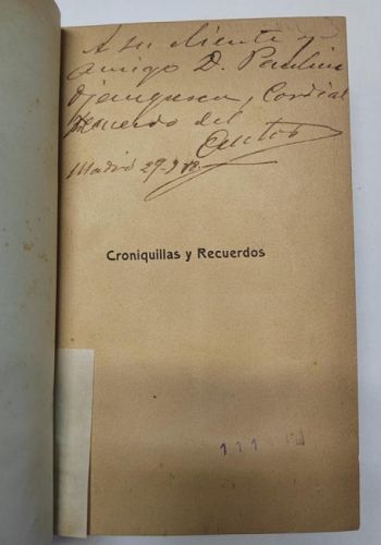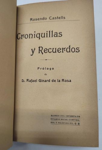 Castells, Rosendo Croniquillas y recuerdos Madrid, Imprenta de Ricardo Rojas, 1911. Tapa dura, media piel con nervios. 11x17,5 cm. 261pp. Tapas algo rozadas, guardas algo oxidadas. Dedicado por el autor. Buen estado.