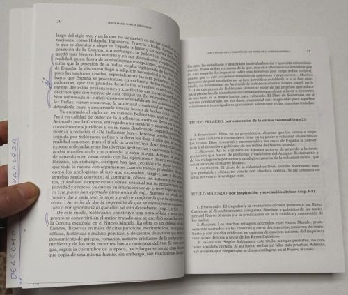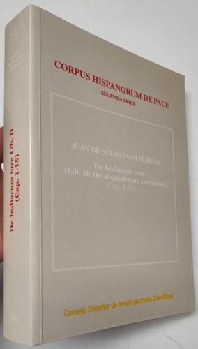 Juan de Solorzano Pereira De Indiarum iure (Lib. II: De acquisitione Indiarum) (Cap. 1-15) CSIC, 1999. Rústica. 17x24 cm. 586pp. Bilingüe. Firma de antiguo propietario. Unas pocas páginas con marcas o anotaciones a bolígrafo. Por lo demás, buen estado.