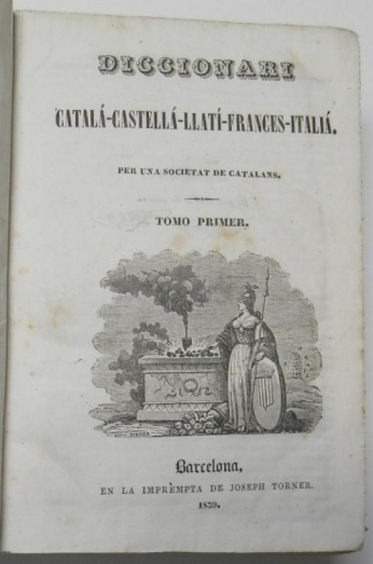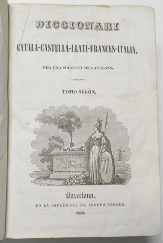 Diccionari català-castellà-llatí-francès-italià (2 tomos) Barcelona, Imprempta de Joseph Torner, 1839. Tapa dura. 16,5x23,5 cm. 1063+1148pp. Firma de antiguo propietario. Buen estado, alguna motita de óxido.