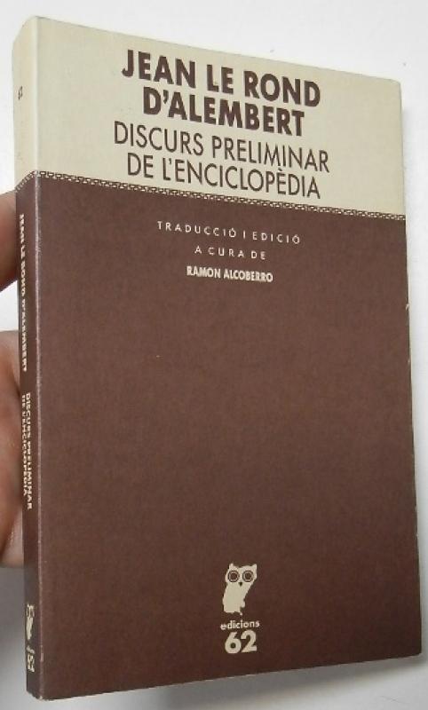 D'Alembert, Jean Le Rond Discurs preliminar de l'Enciclopèdia Edicions 62, 1992. ,Rústica con solapas. 12x18,5 cm., 225pp. Libro en catalán. Muy buen estado.