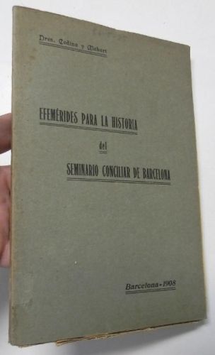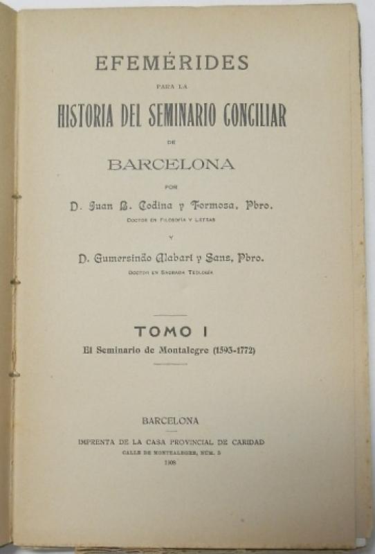Juan B. Codina, Gumersindo Alabart Efemérides para la historia del Seminario Conciliar de barcelona. Tomo I. El Seminario de Montalegre (1593-1772) Barcelona, Imprenta de la Casa Provincial de Caridad, 1908. Rústica. 14x22,5 cm. 96pp. Buen estado.