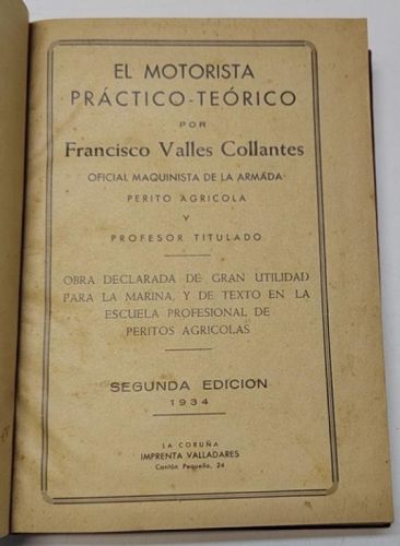 Francisco Valles Collantes El motorista práctico-teórico La Coruña, Imprenta Valladares, 1934. Tapa dura. 15,5x21 cm. 451pp. Buen estado.