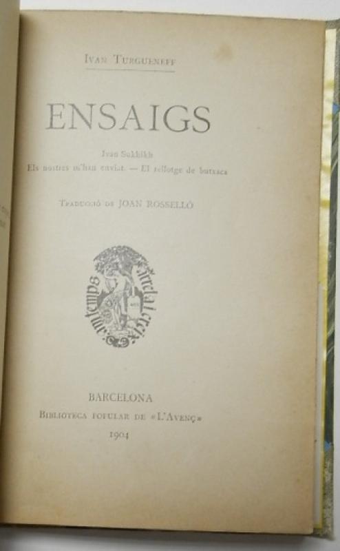 Turgueneff, Ivan Ensaigs Biblioteca popular de l'Avenç, 1904. Encuadernación casera en tapa dura. 11,5x16,5 cm. 117pp. Libro en catalán. Buen estado.