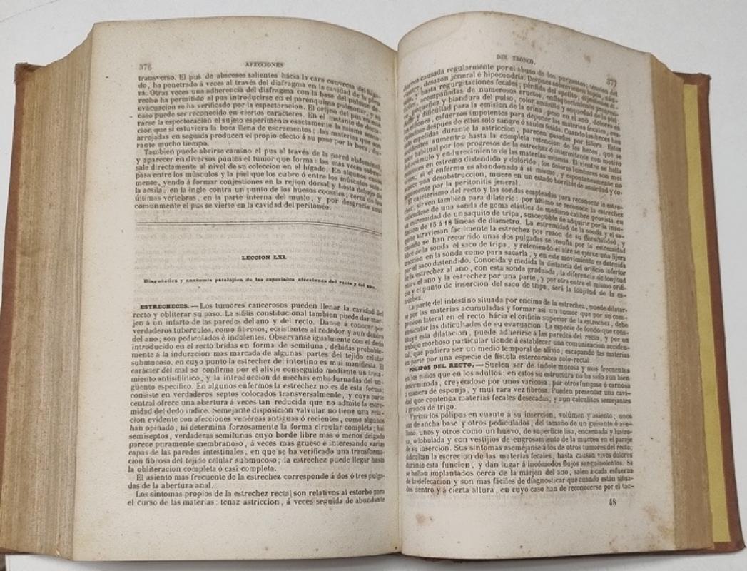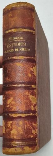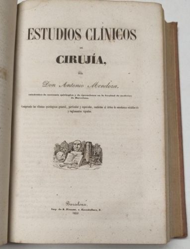 Antonio Mendoza Estudios clínicos de cirujía Barcelona, Imp. de A. Frexas, 1850. Cuatro partes en un tomo de tapa dura, media piel. 14,5x21,5 cm. 253+240+416+128pp. Buen estado, algo deslucido. Lomo rozado.