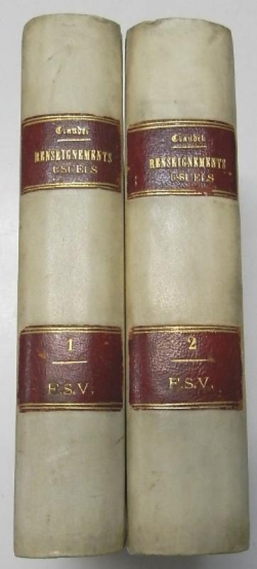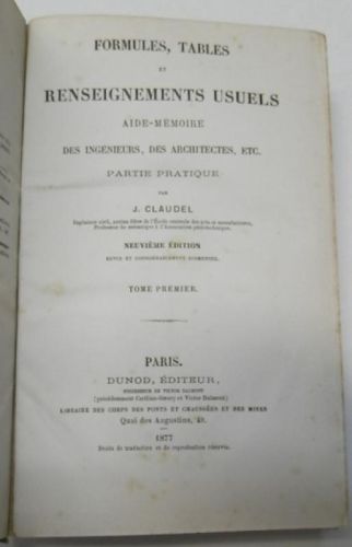 Claudel, J. Formules, tables et renseignements usuels Paris, Dunod ed., 1877. Dos tomos en tapa dura. 14,5x22,5 cm. 1857pp. Libros en francés. Buen estado, con motitas de óxido.