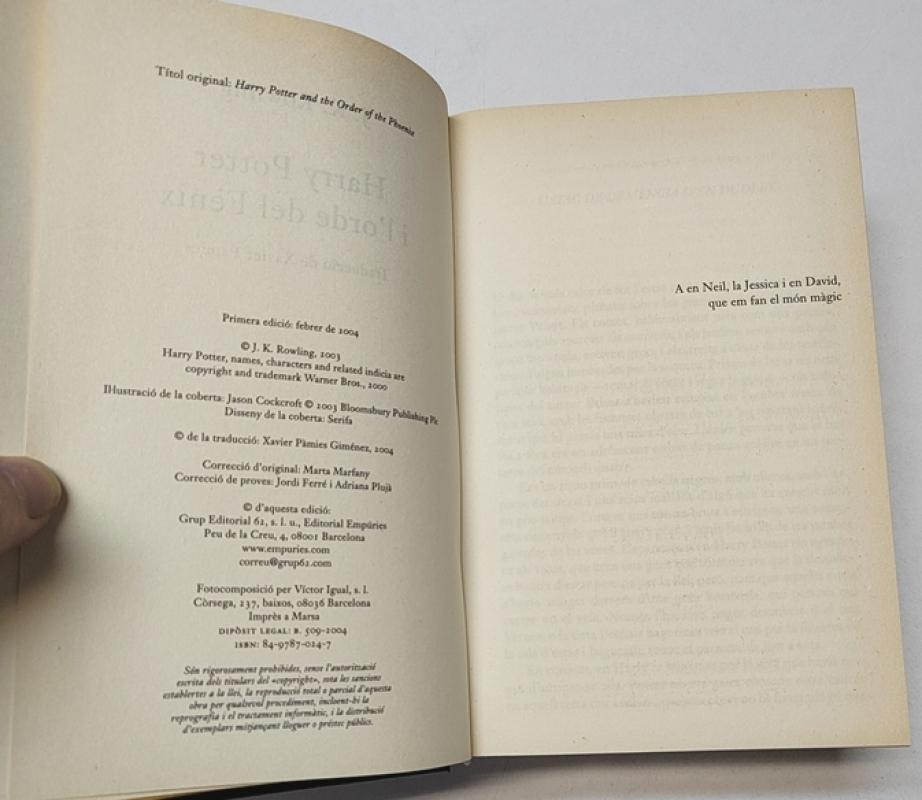 J.K. Rowling Harry Potter i l'orde del Fènix Empúries, 2004, 1ª edición. Tapa dura con sobrecubierta, 13x20,5 cm. 968pp. Libro en catalán. Buen estado.