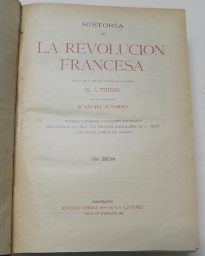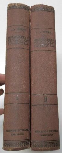 L.A. Thiers Historia de la Revolución Francesa Barcelona, Juan Molins, editor, sin fecha. Dos tomos. Tapa dura. 19,5x27 cm. 827+1003 pp. Tiene 4 páginas descosidas, por lo demás, buen estado.