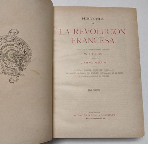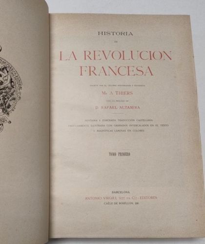 A. Thiers Historia de la Revolución Francesa Barcelona, Antonio Virgili Editores, c. 1911. Dos tomos, media piel. 19x27 cm. 827+1004pp. Buen estado.