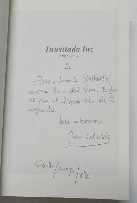 María del Valle Rubio Inusitada luz Ayuntamiento de Chucena, 2007. Rústica con solapas. 14x21,5 cm. 582pp. Dedicado por la autora. Buen estado.