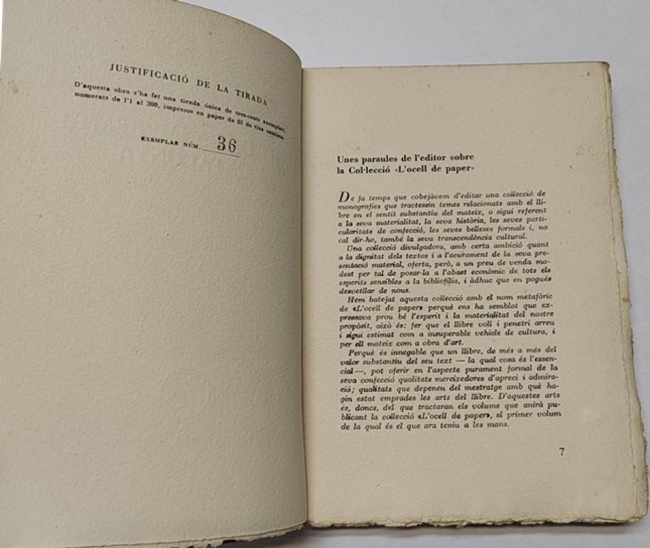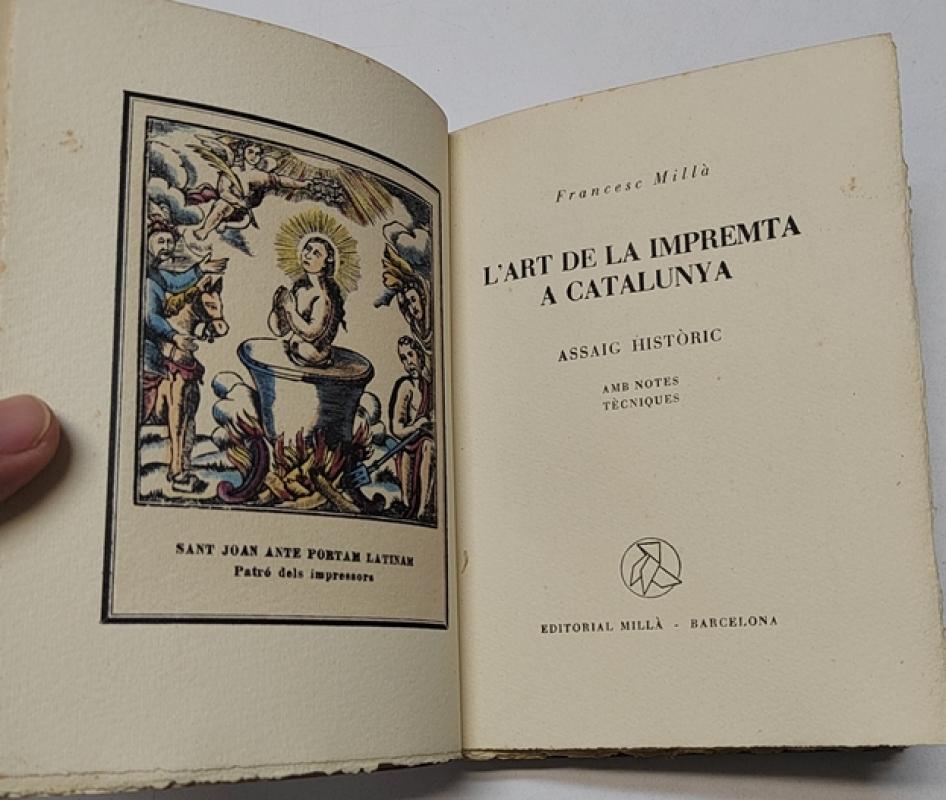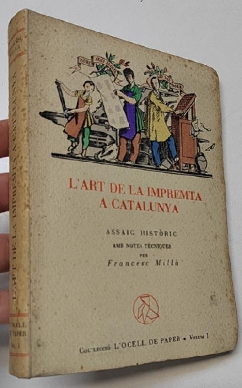 Francesc Millà L'art de la impremta a Catalunya Editorial Millà, 1949. "D'aquesta obra s'ha fet una tirada única de tres-cents exemplars, numertas de l'1 al 300, impresos en paper de fil de tina catalana" (ejemplar nº 36). Rústica. 13x18 cm. 115pp. Libro en catalán. Cubiertas deslucidas, con motitas de óxido, interior muy bien.