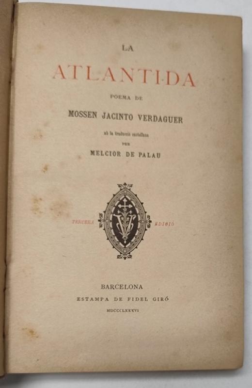 Jacinto Verdaguer La Atlántida Barcelona, Estampa de Fidel Giró, 1886. Edición bilingüe español-catalán. Tapa dura. 11,5x18 cm. 343pp. Tapas deslucidas, interior bien.