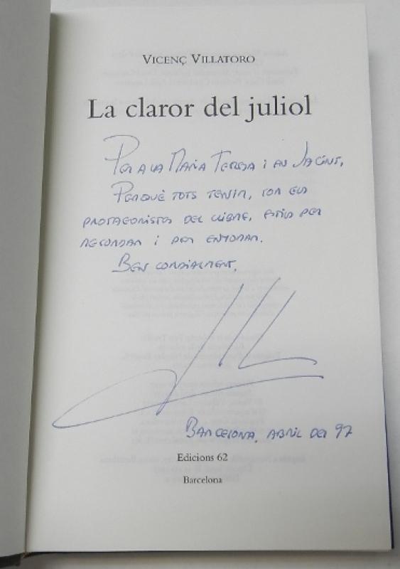 Villatoro, Vicenç La claror del juliol Edicions 62, 1997. Tapa dura. 13x21,5 cm. 443pp. Libro en catalán. Dedicado por el autor. Buen estado.