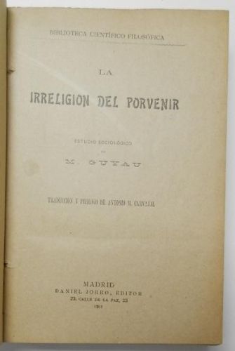 Guyau, M. La irreligión del porvenir Madrid, Daniel Jorro, editor, 1911. Tapa dura, media piel. 15,5x22,5 cm. 537pp. Buen estado.