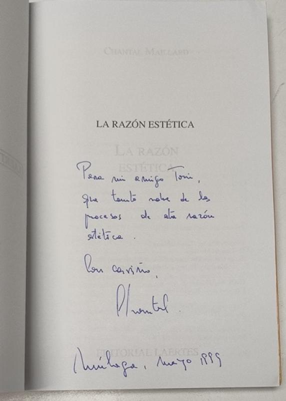 Chantal Maillard La razón estética Laertes, 1998, 1ª edición. Rústica con solapas. 12,5x20 cm. 256pp. Dedicado por la autora. Buen estado, lomo decolorido