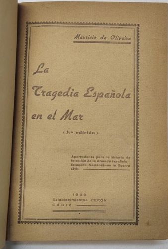 Mauricio de Oliveira La tragedia española en el mar Cádiz, Establecimientos Cerón, 1939. Tapa dura. 13,5x19 cm. 149pp. Buen estado.