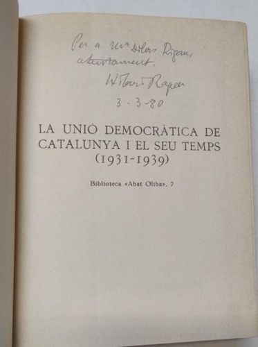 Hilari Raguer i Suñer La unió democràtica de Catalunya i el seu temps (1931-1939) Publicacions de l'Abadia de Montserrat, 1976. Tapa dura con sobrecubierta. 15,5x21 cm. 582pp. Buen estado, sobrecubierta algo deslucidas. Dedicado por el autor.