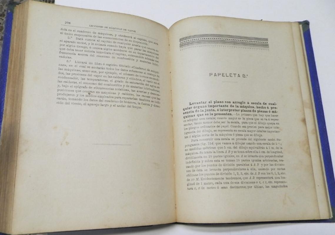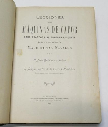 José Quintana y Junco, Joaquín Ortiz de la Torre y Huidobro Lecciones de máquinas de vapor Santander, Imprenta y encuadernación de Blanchard y Arce, 1903. Tapa dura, media piel. 16,5x24 cm. 309+apéndices+desplegables. Algo deslucido.