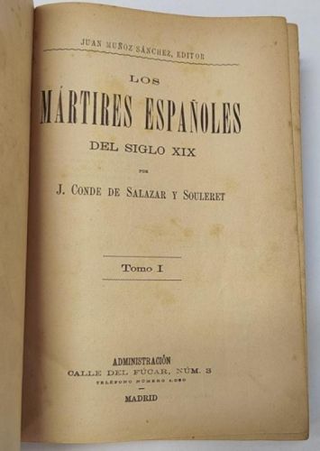 J. Conde de Salazar y Souleret Los mártires españoles del siglo XIX. Tomo I Madrid, Juan Muñoz Sánchez, editor, s.f. Tapa dura. 15x22 cm. 880pp. Motitas de óxido, por lo demás, buen estado.