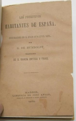 Humboldt, G. de Los primitivos habitantes de España Madrid, Librería de José Anllo, 1879. Encuadernado en tapa dura, tela. 12x17,5 cm. 224pp. Buen estado.
