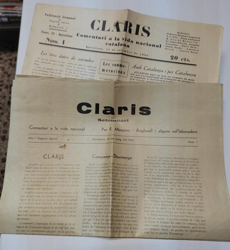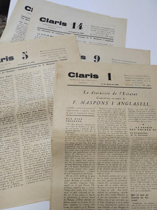 Lote de 19 números del semanario Claris números 1, 2, 3, 4, 5, 6, 7, 8, 9, 10, 11, 14, 15, 16, 17, 18. año 1932 + número 1 segunda época, 1933 + números 1 y 2 segunda época, 1936 4 páginas por número. En catalán. Buen estado.