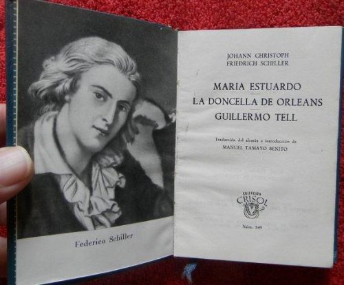 Christoph, Johann; Schiller, Friedrich MARIA ESTUARDO / LA DONCELLA DE ORLEANS / GUILLERMO TELL Madrid, Aguilar, Colección Crisol 149, 1960. Tapa dura, plena piel. 8,5x12 cm. 516pp. Frontis. Buen estado.