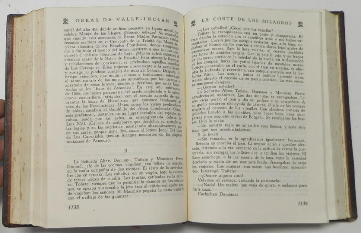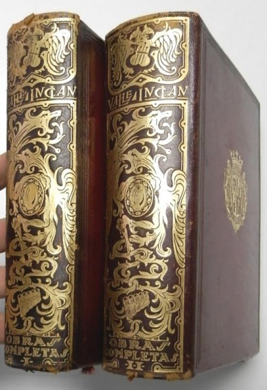 Valle-Inclán, Ramón del Obras completas (2 tomos) Madrid, Editorial Rua Nova, 1944. Tapa dura, plena piel, 14,5x20 cm. 1624+1967pp. Tapas algo rozadas, algunos puntitos de óxido en el corte de las hojas, por lo demás, buen estado.