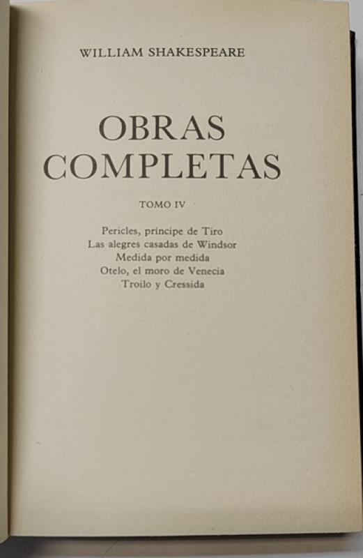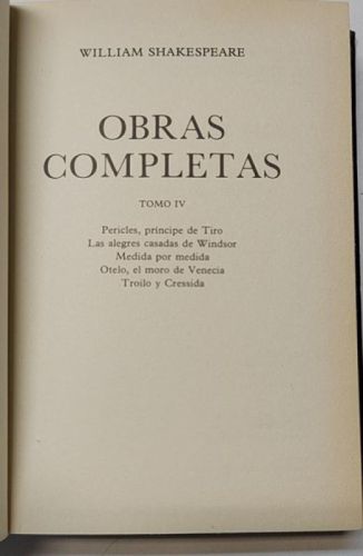 Shakespeare, William Obras completas IV (Pericles, príncipe de Tiro / Las alegres casadas de Windsor / Medida por medida / Otelo, el moro de Venecia / Troilo y Cressida) SA Promoción y ediciones 1999. Tapa dura. 13,5x19 cm. 308pp. Muy buen estado.