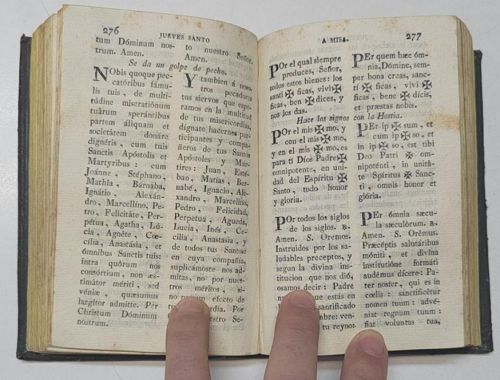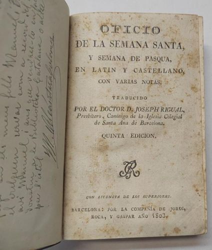 Oficio de la Semana Santa, y Semana de Pasqua, en latín y castellano Barcelona, Compañía de Jordi, Roca y Gaspar, 1803. Tapa dura .10x15 cm. 683pp. Escrito de antiguo propietario en hoja de cortesía. Algunas motitas de óxido, por lo demás, buen estado.