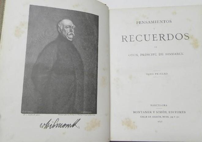Otón, Príncipe de Bismarck Pensamientos y recuerdos (Tomo primero) Barcelona, Montaner y Simón, 1898. Tapa dura. 17x22,5 cm., 415pp. Buen estado, algunas motitas de óxido.