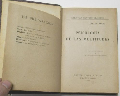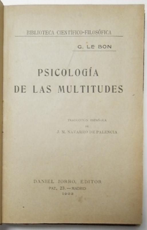 G. Le Bon Psicología de las multitudes Madrid, Daniel Jorro, editor, 1903. Tapa dura, media piel. 13x19 cm. 252pp. Falta un trozo de portadilla, por lo demás, buen estado.