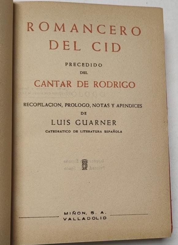 Romancero del Cid. Precedido del Cantar de Rodrigo Recopilación, prólogo, notas y apéndices de Luis Guarner Valladolid, Miñón, 1954. Tapa dura. 11,5x16,5 cm. 547pp. Buen estado.