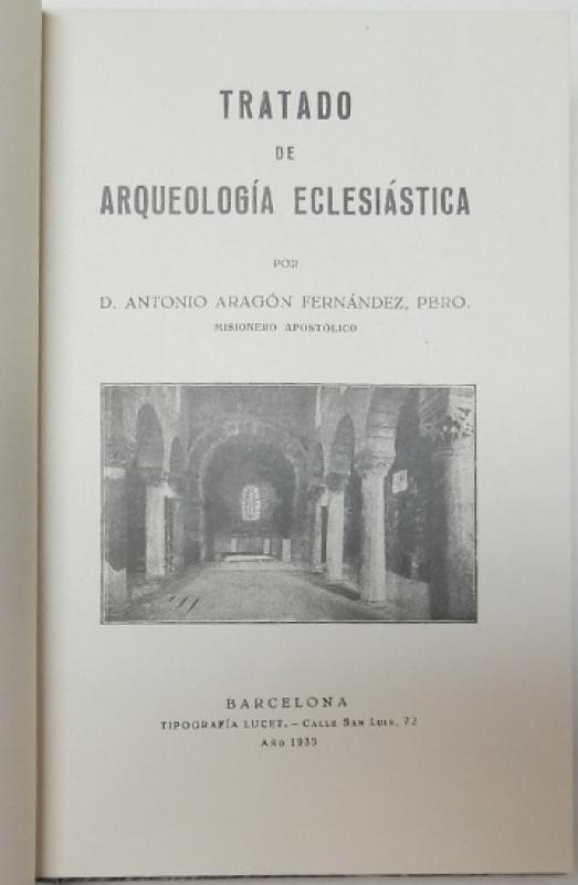 Antonio Aragón Fernández Tratado de arqueología eclesiástica Barcelona, Tipografía Lucet, 1935. Encuadernado en tapa dura. 14x22 cm, 257pp. Muy buen estado.