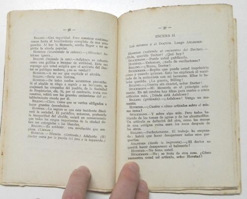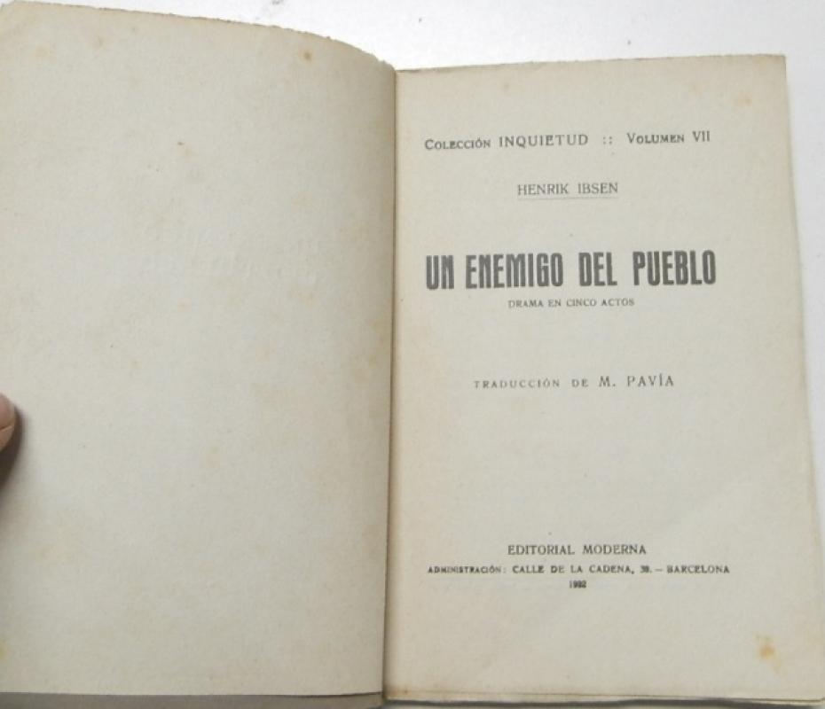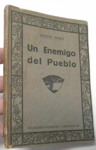 Ibsen, Henrik Un enemigo del pueblo Barcelona, Editorial Moderna. Colección Inquietud, Vol. VII, 1922. Rústica. 11,5x17 cm. 128pp. Cubiertas deslucidas, interior bien.