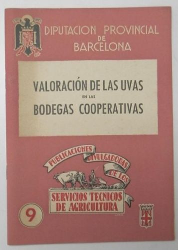 Valoración de las uvas en las bodegas cooperativas Diputación provincial de Barcelona. Servicios técnicos de Agricultura, nº 9. 1943. Rústica. 15x21 cm. 35pp. Buen estado.